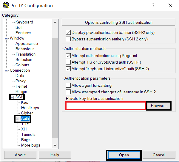 Browse버튼을 눌러 아까 PuTTYgen으로 생성된 키를 선택합니다.