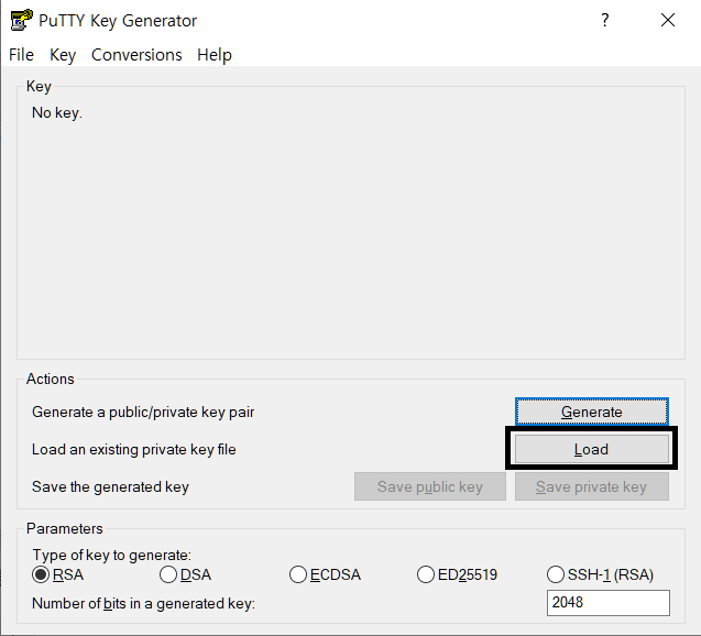 먼저 PuTTYgen를 실행하여 검정색 네모로 표시된 Load 버튼을 눌러줍니다.
