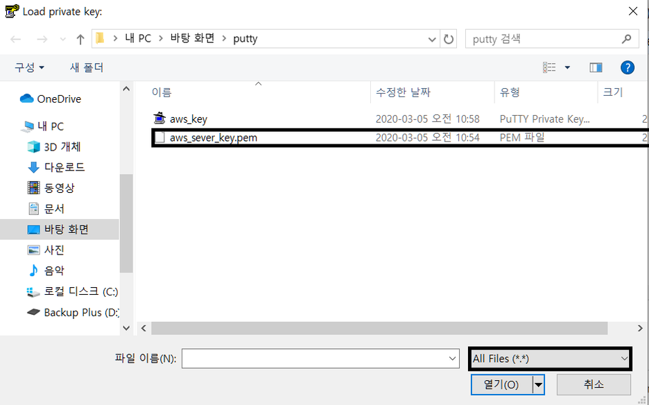 파일유형을 모든파일로 바꿔주고, aws에서 인스턴스를 생성할 때 다운로드받은 pem파일을 선택하여 줍니다.