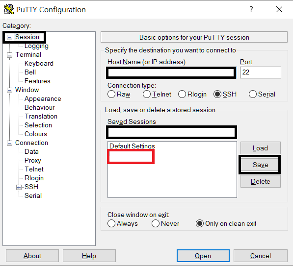 Session 메뉴를 선택해 초기 화면으로 돌아와 hostName에 방금 전 입력한 ip주소가 제대로 정혀있는지 확인후, 아래에 Saved Sessions에 저장할 이름을 적은 뒤 Save버튼을 누르면 빨강색 네모칸에 해당 이름으로 옵션이 저장이 됩니다.