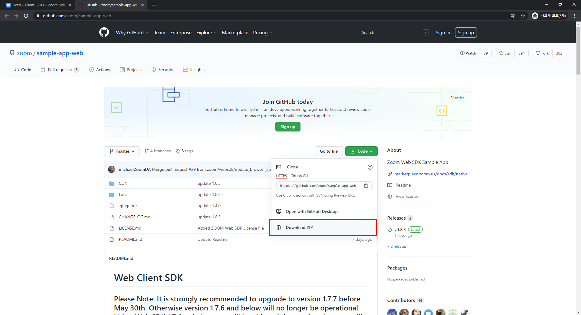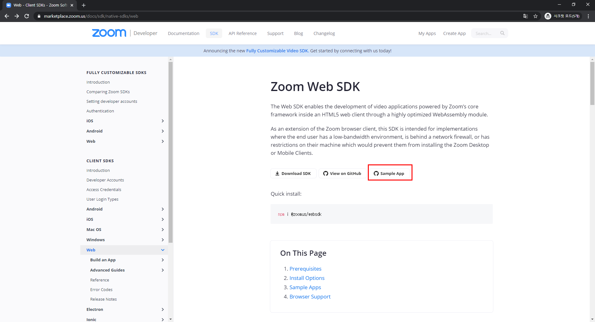 링크를 통해 zoom marketplace에 등록된 web sdk 영역으로 이동을 한다.