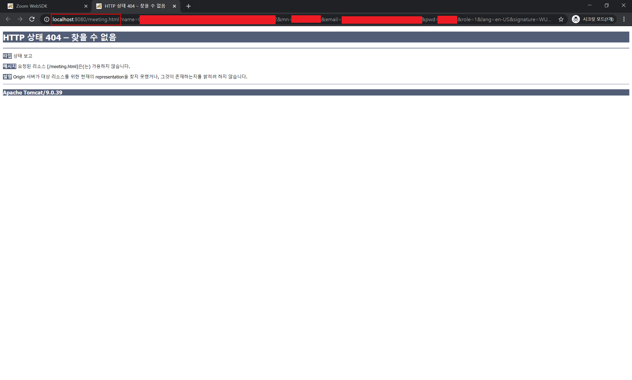 버튼을 누르면 404 에러가 발생을 한다. url을 자세히 보면 도메인 뒤에 바로 meeting.html 파일을 찾는 것이 보인다.